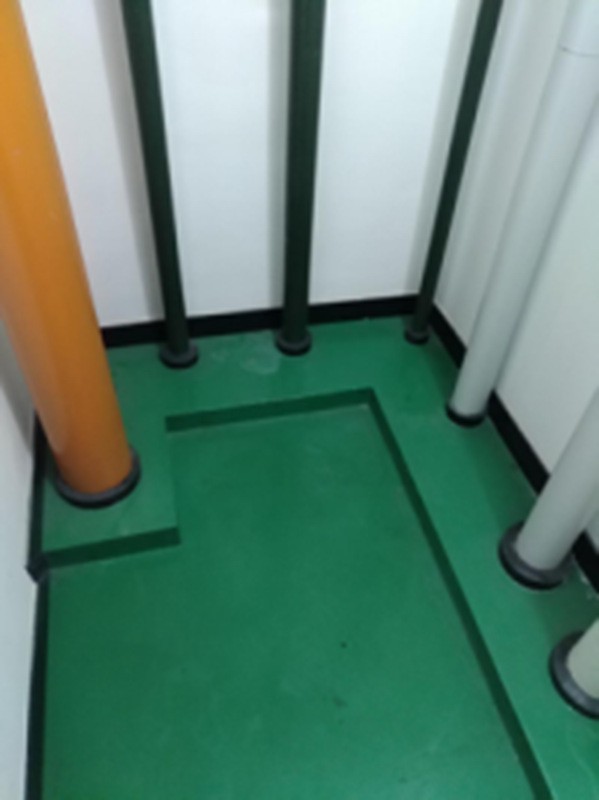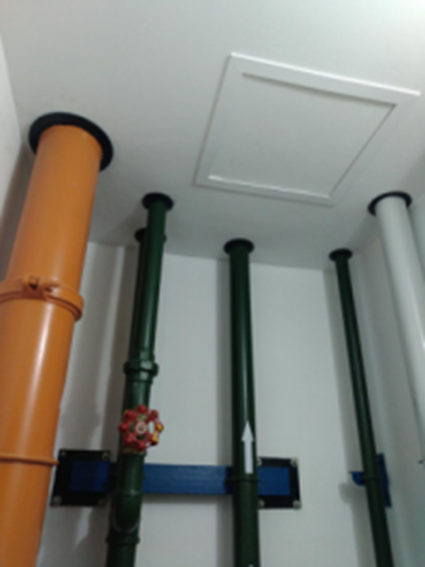 管道根据使用功能分色,穿楼面、顶面装饰采用橡胶圈,地面采用地坪漆配合瓷砖踢脚线,检修井规范留置,整体做工精致,观感上乘。