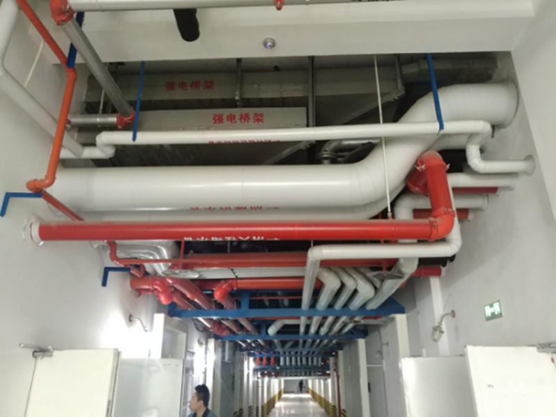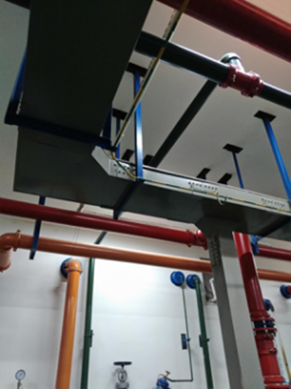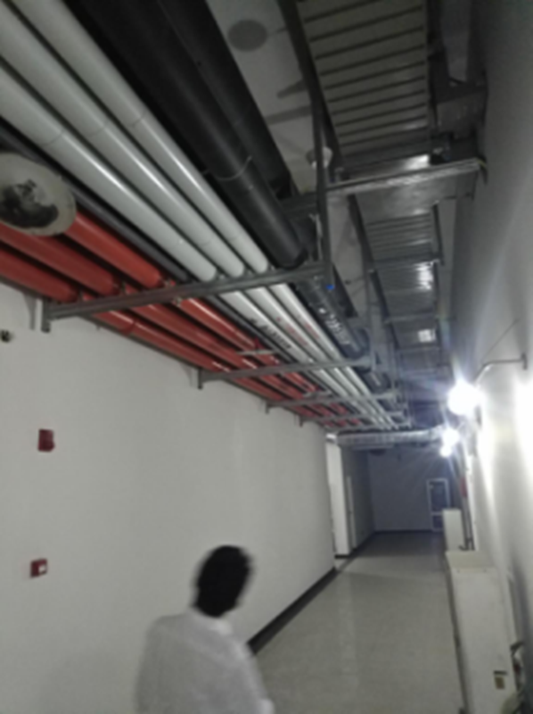 地下室通道,空间有限,桥架、管线较多,对综合布线、碰撞检查要求高,照片中许多管道连续拐弯避让,但仍然有序,分色清晰,上下排布规范,充分体现了策划用工;由于管线较多,采用吊架、梁架方式耐久性都存在欠缺,因此具体情况增加了支架进行加强,牢固美观。